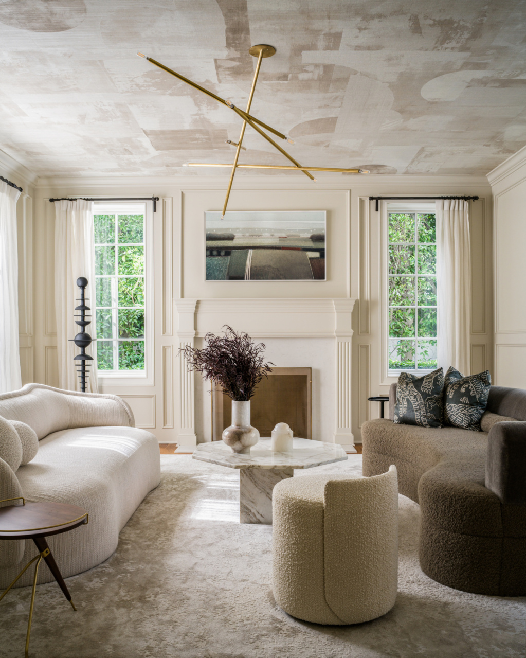 Authentic artwork composed of freeform brushstrokes transforms into a large, immersive mural wallcovering. The mural may be printed on grasscloth, silk, linen, paper, authentic metallic leaf